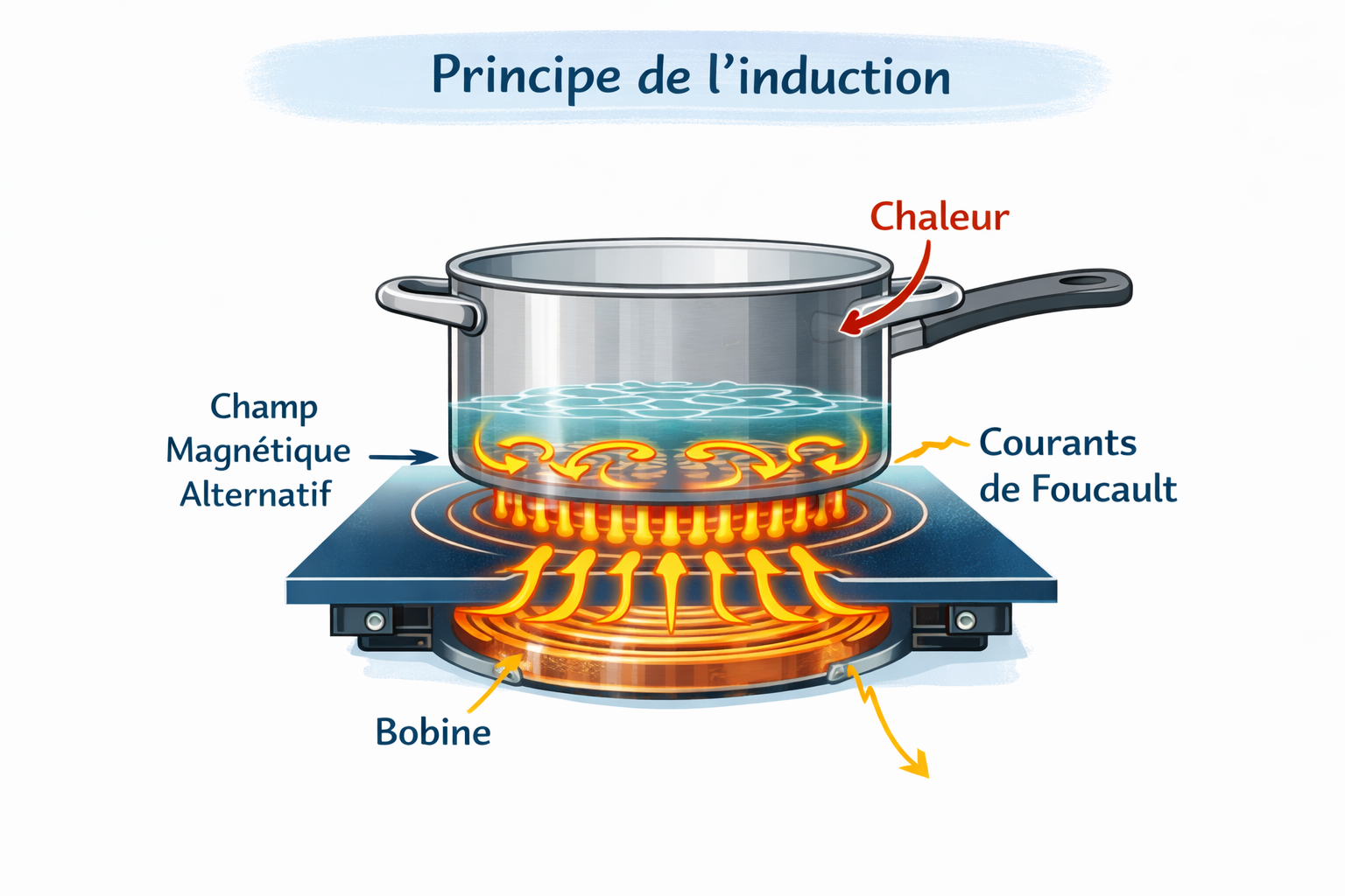 Toutes les plaques à induction fonctionnent sur le même principe électromagnétique. Une bobine placée sous la vitre génère un champ magnétique alternatif. Ce champ traverse le récipient et provoque l’apparition de courants de Foucault dans son fond. Ces courants échauffent directement le métal, sans chauffer la vitre elle-même.