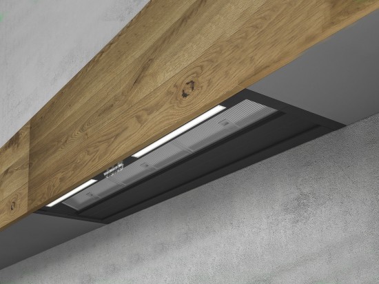- La hotte présente deux finitions fixes (verre noir et Dekton structuré gris foncé) et une finition nue à habiller