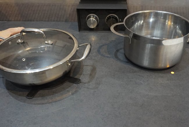 Le plan de travail ultra-compact en Dekton, est résistant aux rayures et à la chaleur. Cependant Gaggenau propose plusieurs accessoires de protection aimantés. Ces protecteurs de surface se collent sous la casserolerie. Ils permettent de pouvoir déplacer en silence les ustensiles, et favorise la détection par les inducteurs.