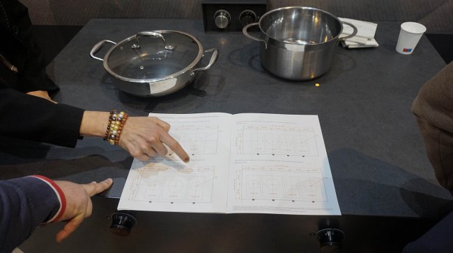 Sur le stand De la marque haut de gamme du groupe BSH, nous avons retrouvé notre conseiller et agent commercial Gaggenau qui avait pris le rôle de chef cuisinier pour les 4 jours du salon Esprit Meuble 2023. Il nous a rapidement montré la dernière innovation de la marque : un plan de travail équipé d’inducteur Bosch par-dessous.