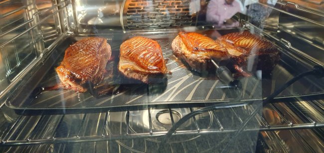 Le point d'orgue de la soirée fut la présentation d'un magret de canard, cuit au programme Rôtissage doux, qui a su conserver toute sa jutosité tout en développant une belle couleur dorée. À ses côtés, une poire pochée sous vide, préparée avec le programme Vacuisine, a ajouté une touche de douceur et d'élégance au plat.