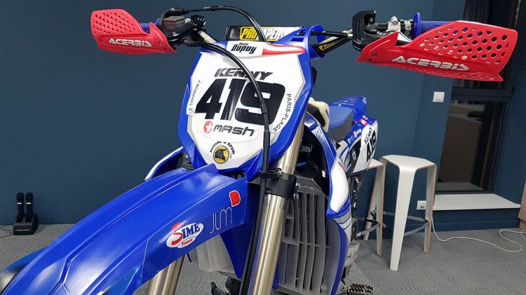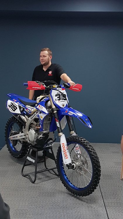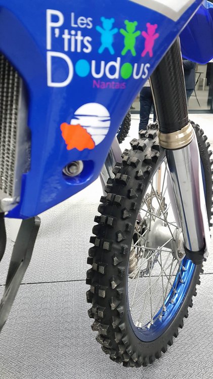 Les motos étaient exposées sur la scène et malgré leurs participations à plusieurs courses dans le sable, elles étaient en bonne état ;). Le logo de JLM diffusion sur le garde boue avant. Voyez plutôt !